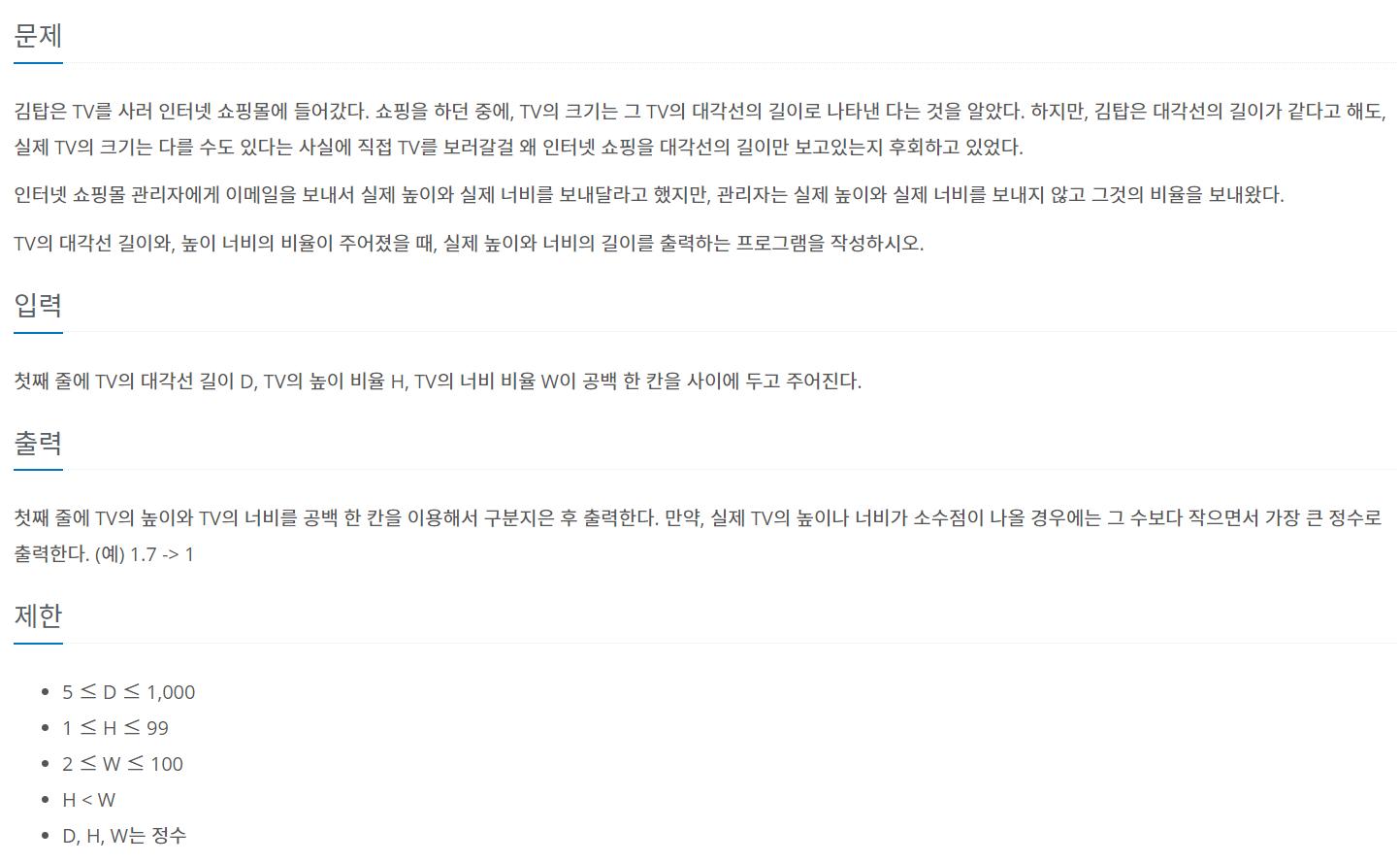 대각선 길이에 cos, sin 값을 곱해주면 가로, 세로 길이를 얻을 수 있음을 알 수 있습니다.