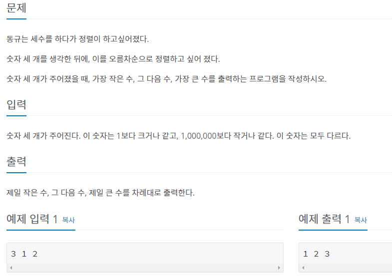 입력받은 정수 3개를 오름차순으로 출력하는 문제입니다.