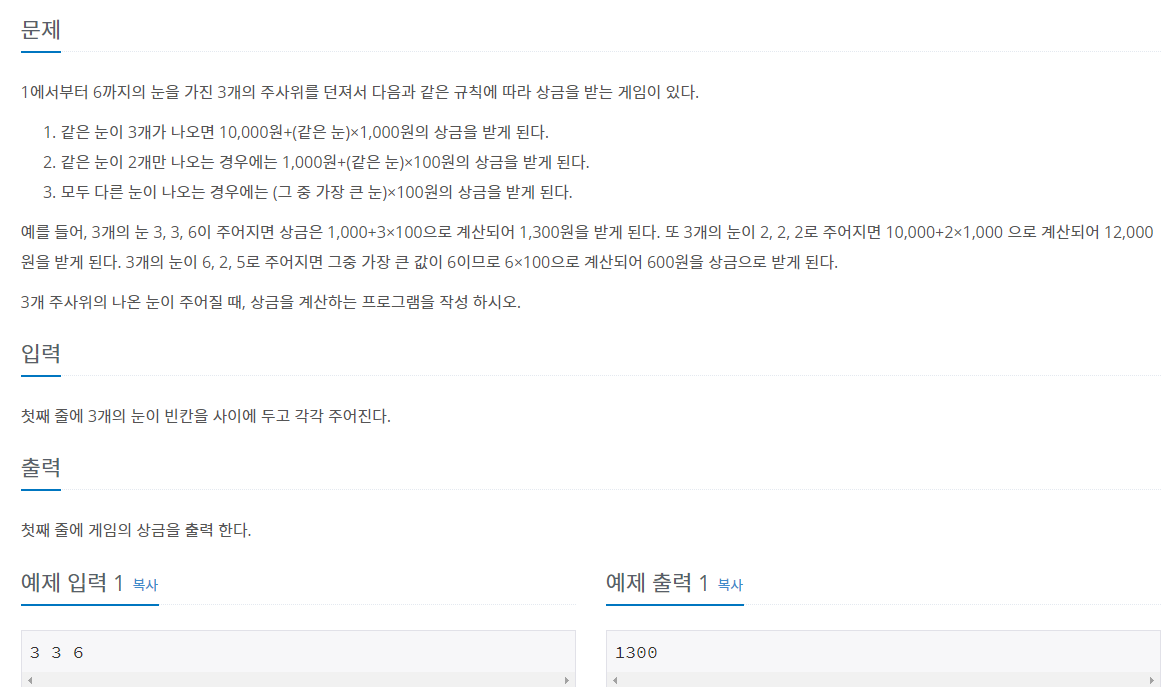 또한 마지막 조건(세 눈이 모두 다른 경우)에서는 최댓값을 구해주어야 하는 귀찮음이 감수됩니다.