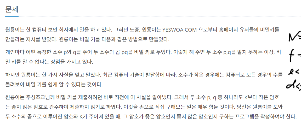 어떤 자연수와 특정 K값에 대해, 이 자연수가 K보다 작은 소수로 나누어떨어지지 않는지 확인하는 문제입니다.