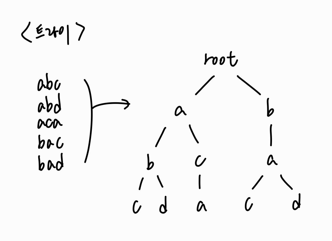문자의 종류가 K개라고 할 때, K진 트리의 구조 즉, 특정 문자 다음에 올 수 있는 문자들을 모두 자식 노드로 가지고 있습니다.