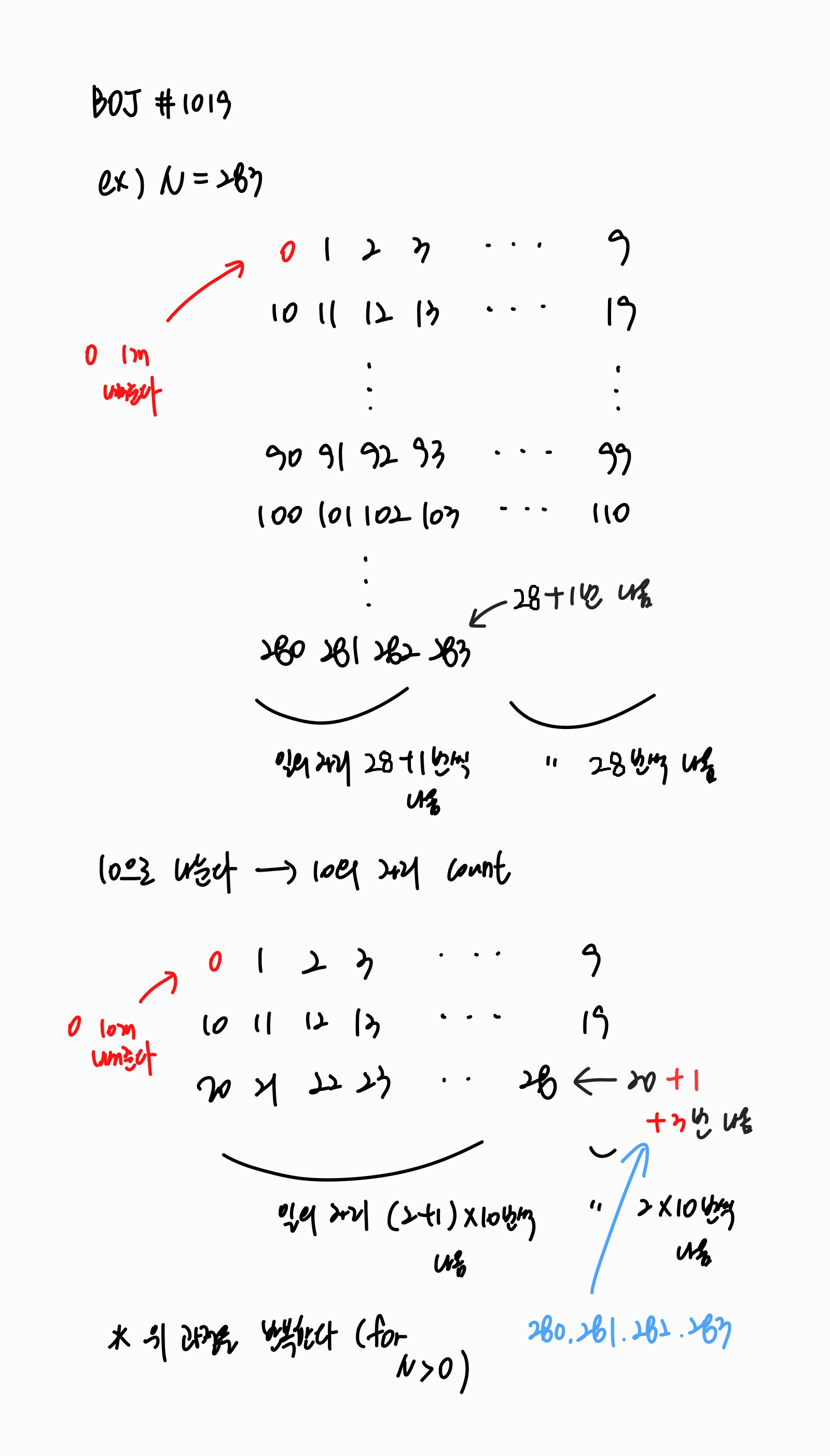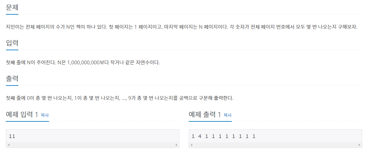 1부터 N까지의 수들 중에서 각 자릿수에 나오는 0~9들의 개수를 구하는 문제입니다.